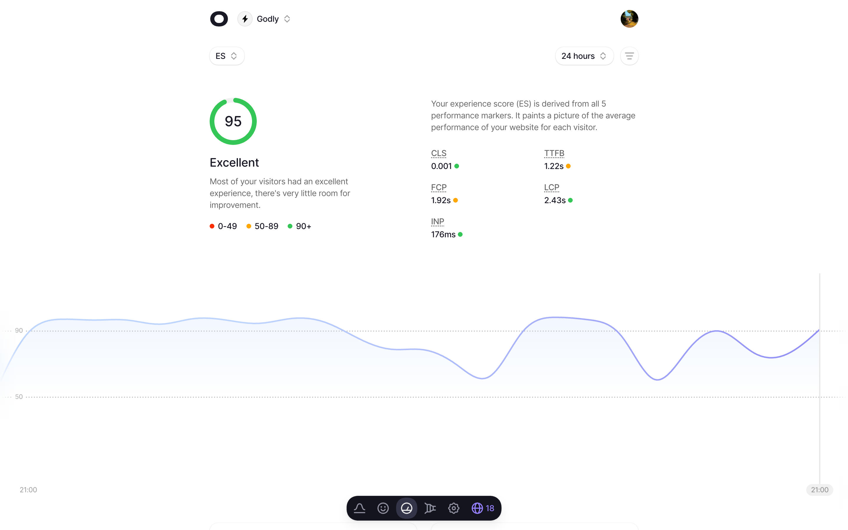 Track real user performance metrics like LCP, INP, CLS, FCP, and TTFB in real time. Your Experience Score will reflect what your visitors are truly experiencing on every device and location.