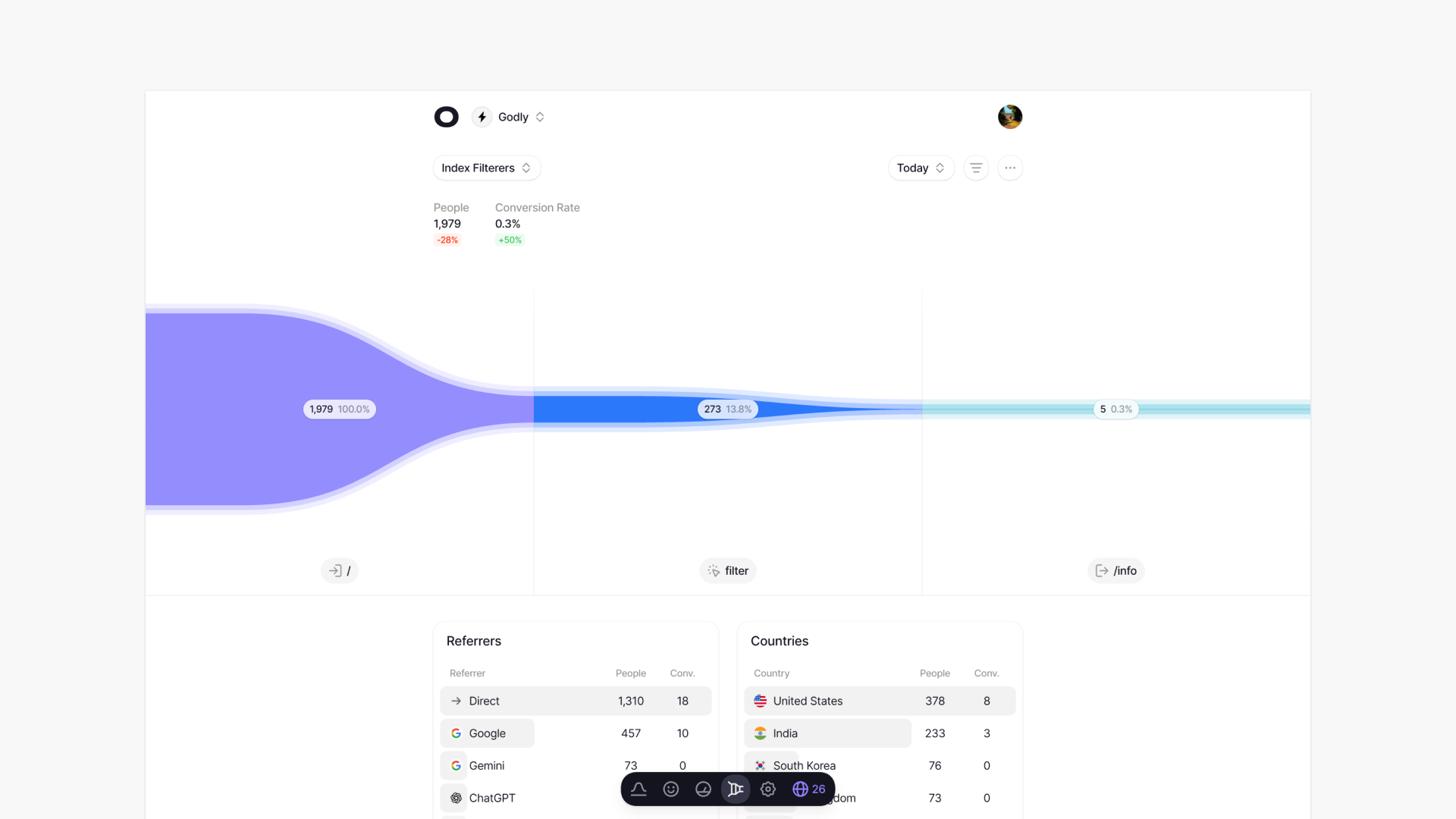 We also show you the top referrers and countries for each funnel as well as the conversion rate for each metric, so you can understand which traffic sources actually convert, not just which ones send the most visitors.